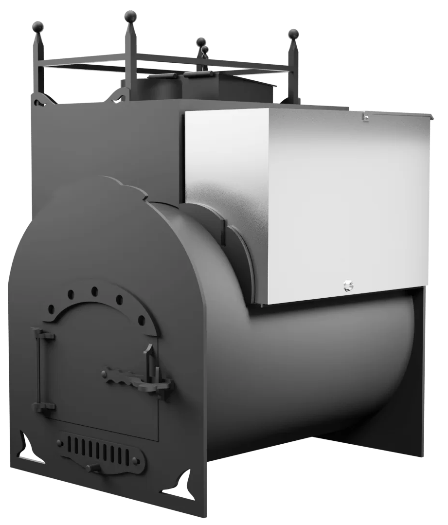 Закрытая каменка с дверцей для подачи пара дает эффект «русской бани». Камни расположены внутри каменки и нагреваются до более высокой температуры в сравнении с открытой каменкой и остаются дольше горячими. Температура нагрева камней до 400 градусов.