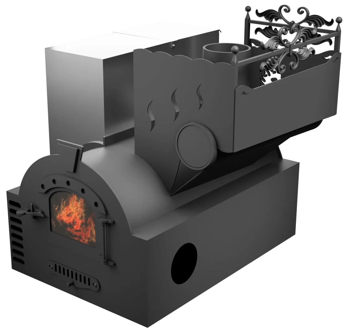 В комплектации данной модели предусмотрена система воздушного отопления (СВО), которая способна обогреть комнату отдыха до 40 м3. В конструкции печи предусмотрен дополнительный контур. Система подключается к электричеству, вентилятор подает холодный воздух, который прогреваясь от печи выходит в комнату отдыха. В комплект входит: вентилятор, гофрированная труба 1 метр, хомуты и обратный клапан.