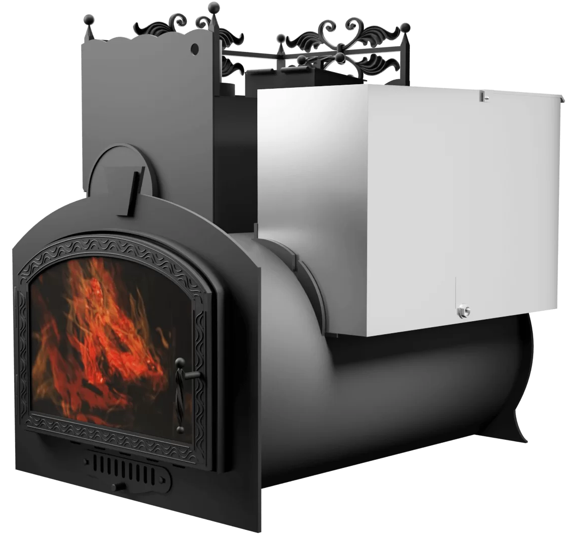 Печь Горыныч 3, каменка закрытая с парогенератором с левой стороны, большая дверь со стеклом